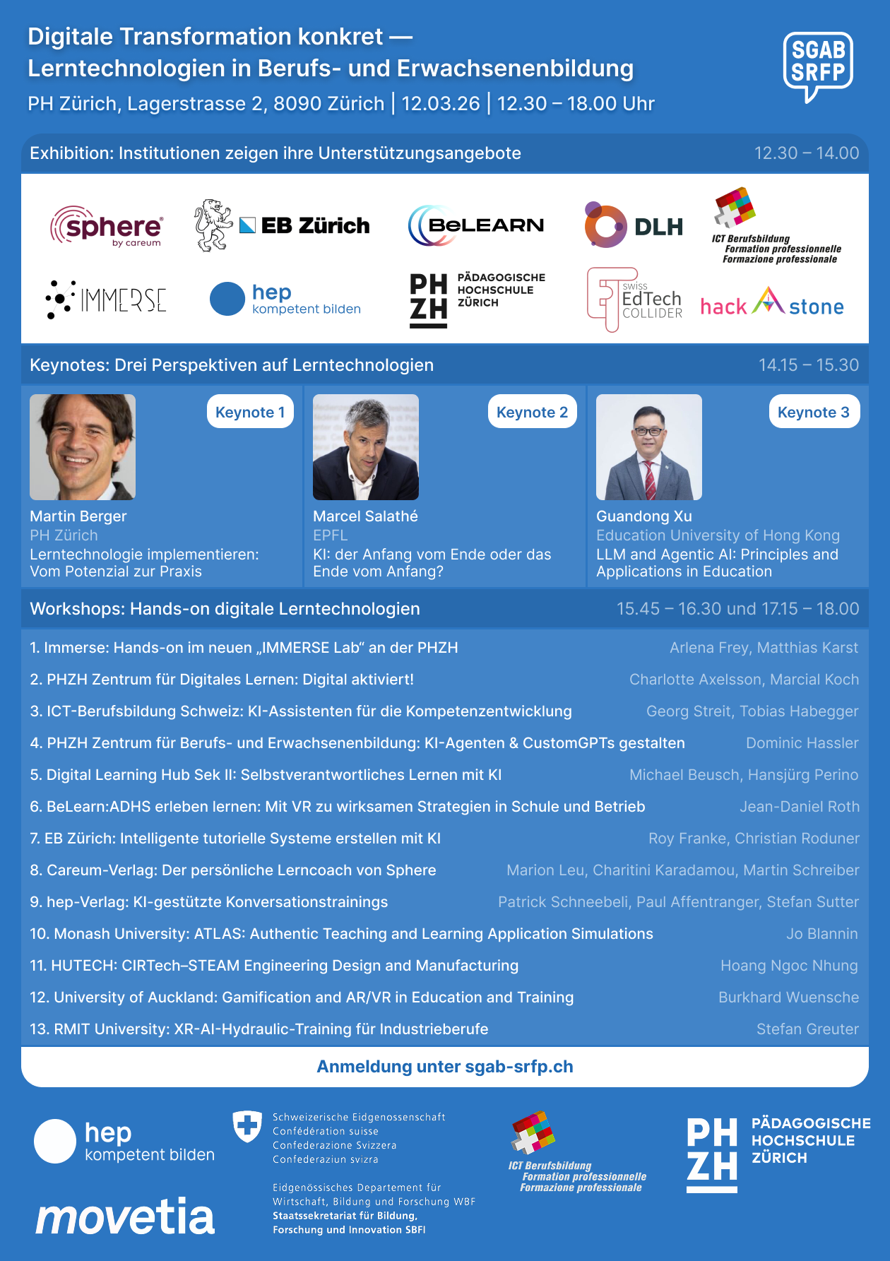 Bereiten Sie sich auf einen Tag intensiven Austauschs und tiefgreifender Einblicke in unser Tagungsthema vor! Am 12. März 2026 veranstalten wir gemeinsam mit der PH Zürich und der ICT-Berufsbildung Schweiz die Tagung: „Digitale Transformation konkret — Lerntechnologien in Berufs- und Erwachsenenbildung“. Wir starten entspannt mit einer Exhibition (inkl. Kaffee & Kuchen), die Ihnen direkt Gelegenheit zum informellen Networking bietet. Anschliessend erwarten Sie drei Impuls-Referate gefolgt von dreizehn individuell wählbaren Workshops aus Praxis und Wissenschaft. So stellen Sie sich Ihr Programm ganz nach Ihren Bedürfnissen zusammen und besuchen insgesamt zwei vertiefende Sessions. Die Workshop-Beschreibungen sowie die Teilnehmenden der Exhibition finden Sie weiter unten auf dieser Seite (s. auch Detailprogramm). Wir freuen uns darauf, Sie an der PH Zürich (Gebäude LAC / LAA) zu begrüssen! Jetzt anmelden und Wissen mitnehmen.